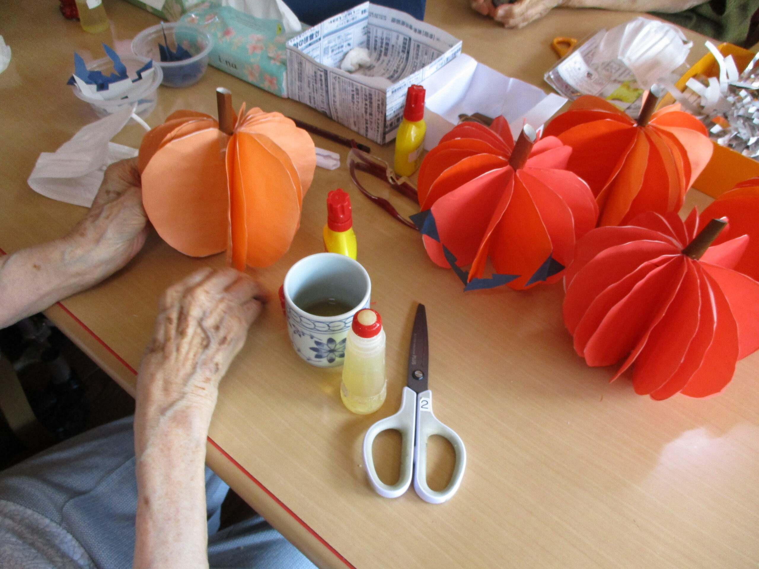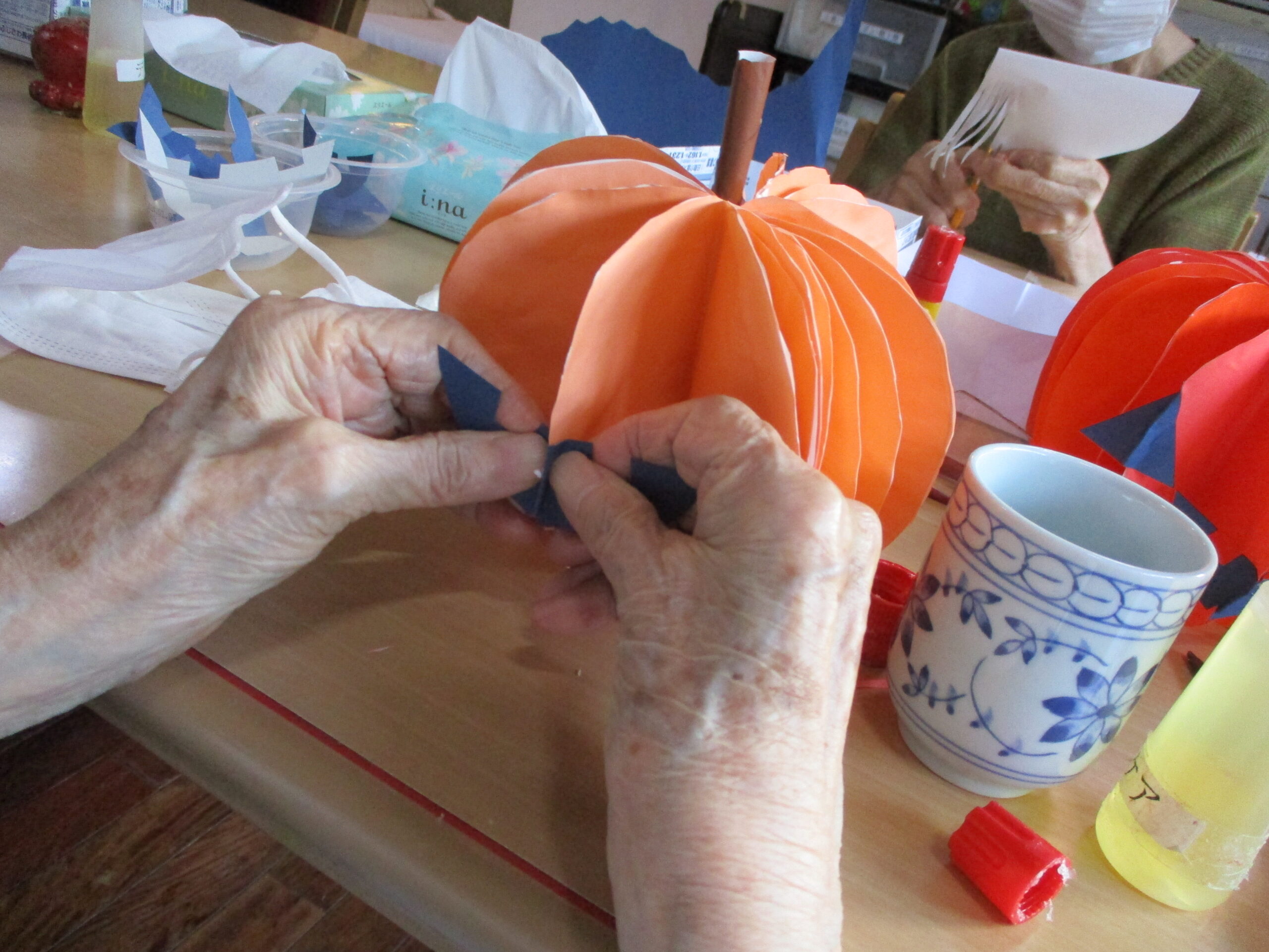 『同じ形にした折り紙を重ね合わせながら、立体のカボチャを作るのよ~』