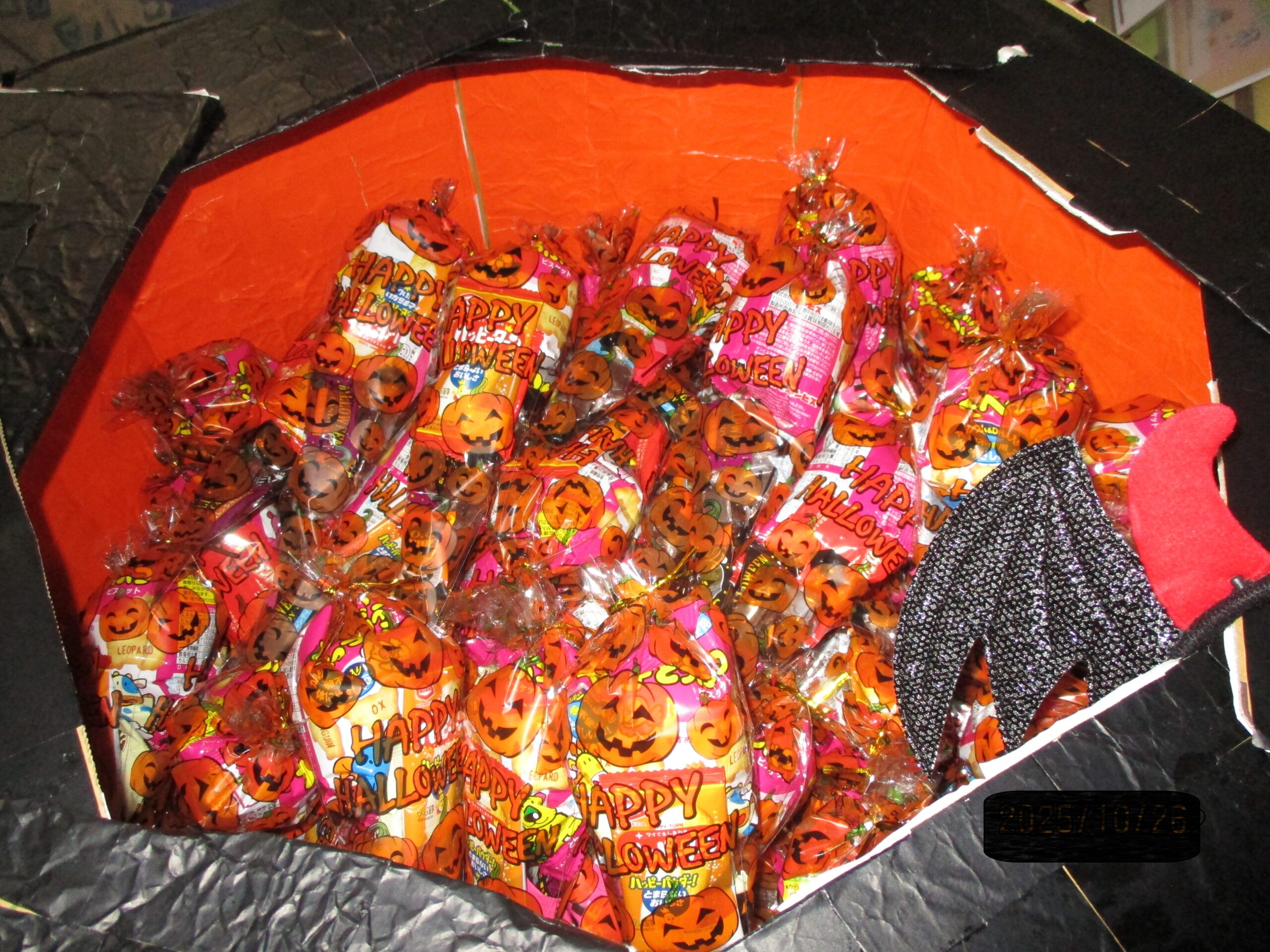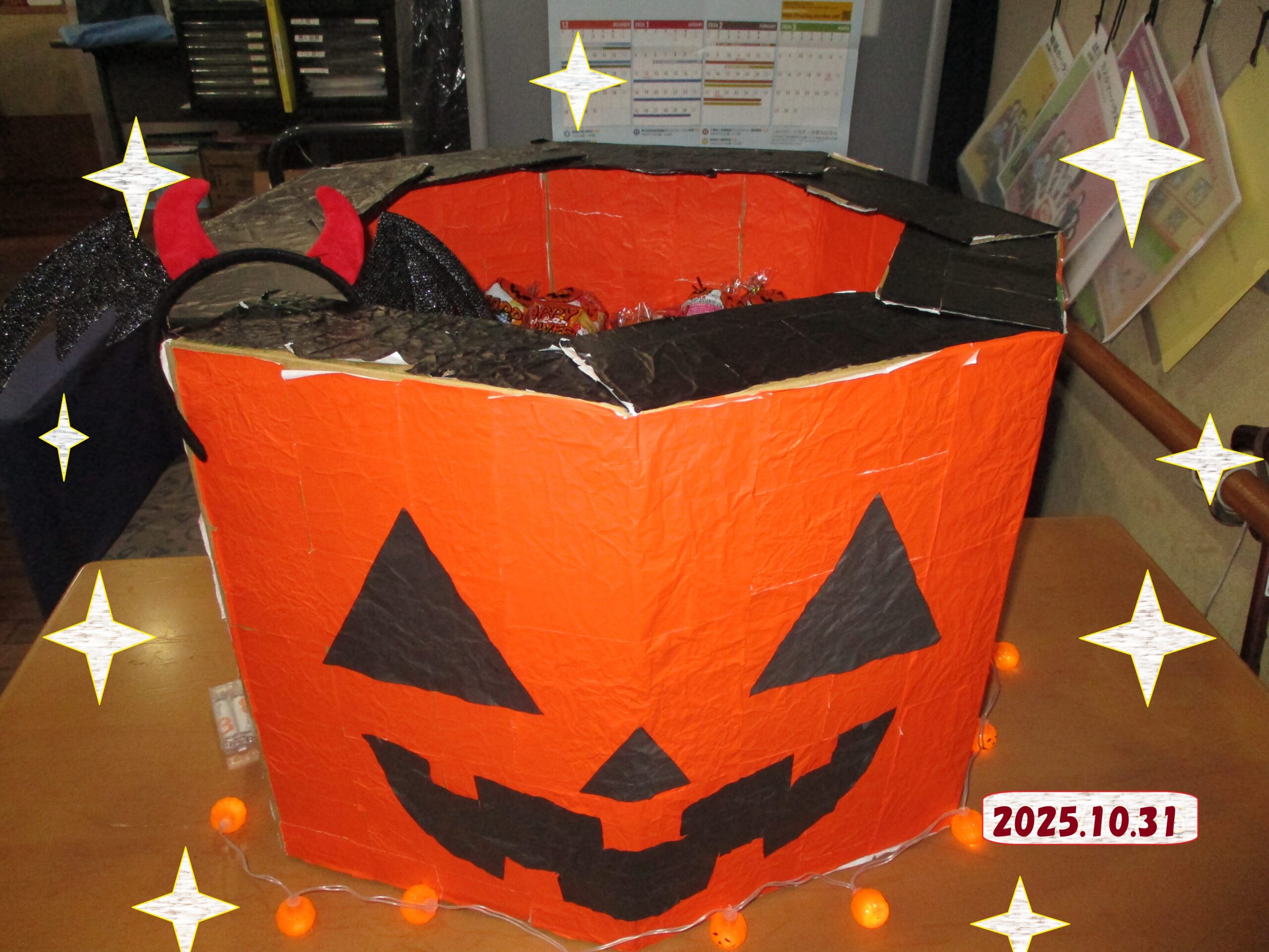 お菓子を入れるジャック・オ・ランタンの大きな箱は、通所リハビリに通う利用者さまの力作です。
